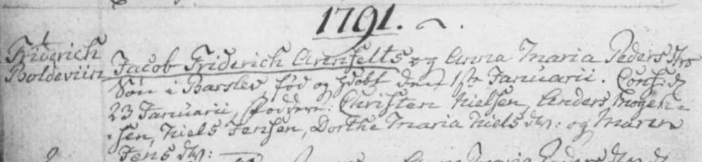 Den 1. januar 1791, nytårsdag, blev Friderich Boldeviin Arenfelt født af sin mor, Anna Maria Pedersdatter i Barslev. Hans far var Jacob Friderich Arenfelt. Det høres lidt finere ud end hvad man ville forvente i bondelandsbyen Barslev. Ud fra fra både fornavn og efternavn kunne man fristes til at tro, at de tilhørte en dansk adelsslægt Arenfeldt med basis i Nordjylland med admiraler og andre fine folk, men hvordan kommer sådanne folk til Barslev?