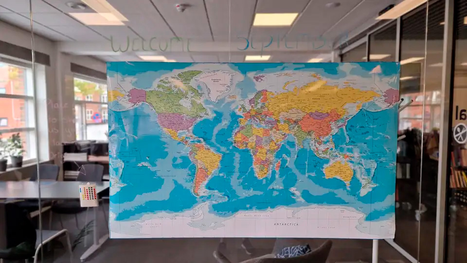 Som en del af Welcome September kan du i løbet af en måned også finde vores store verdenskort på Struer Bibliotek.