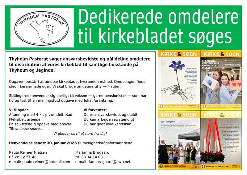 På grund af at Postnord har stoppet, søger man omdelere til Kirkebladet for Jegindø og Thyholm.