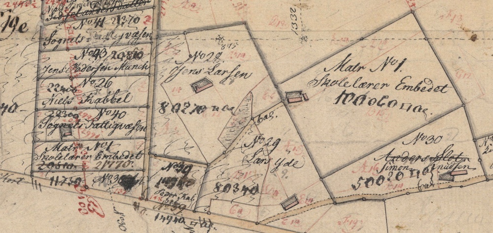 I bemærker, at jorden til skolelærerembedet er delt op i to dele, på hver sin side af vejen,som nu hedder A.C. Hoppesvej opkaldt efter lærer A.C. Hoppe, en lille grund og en lidt større grund, hvorfor nu det ? Folk i dag, som gik i skole hos lærer Hoppe for 60-70 år siden, kan måske tro, at det var fordi der var skole det ene sted og gymnastiksal det andet sted, men nej, forklaringen finder vi i 1802, da Kirsten Clemensdatter dør på en af grundene, sandsynligvis den mindste, som enke efter tidligere skoleholder Søren Christensen Steengaard, som allerede dør i 1786.