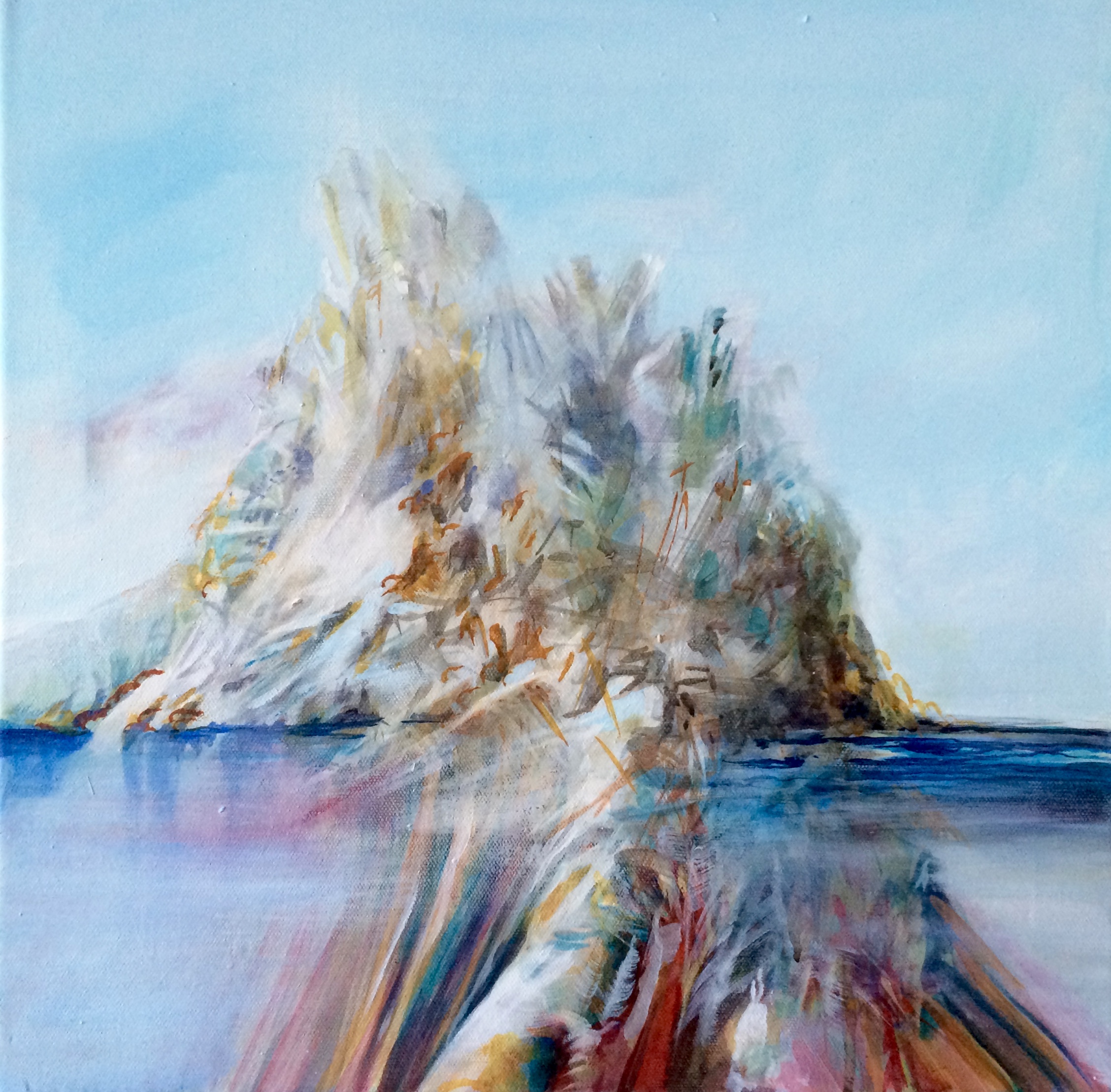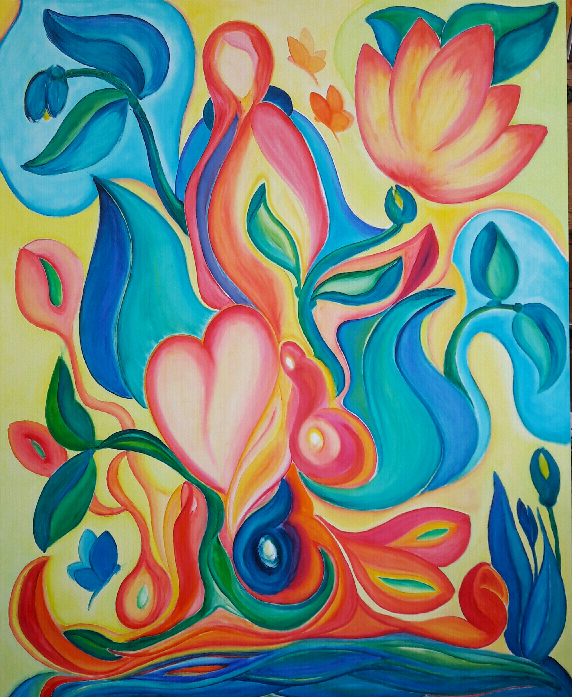 Sammenligner maleprocessen med at ligge på græsset, betragte skyerne og se, hvordan figurer og former udvikler sig - farver, fantasi og livsglæde.