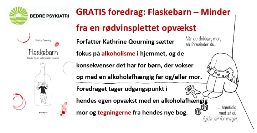 Ungdomshøjskolen Søndbjerggård og Bedre psykiatri vil gerne inviterer dig til det gratis foredrag: "Flaskebarn - minder fra en rødvinsplettet opvækst" onsdag den 5. februar kl. 19.30.