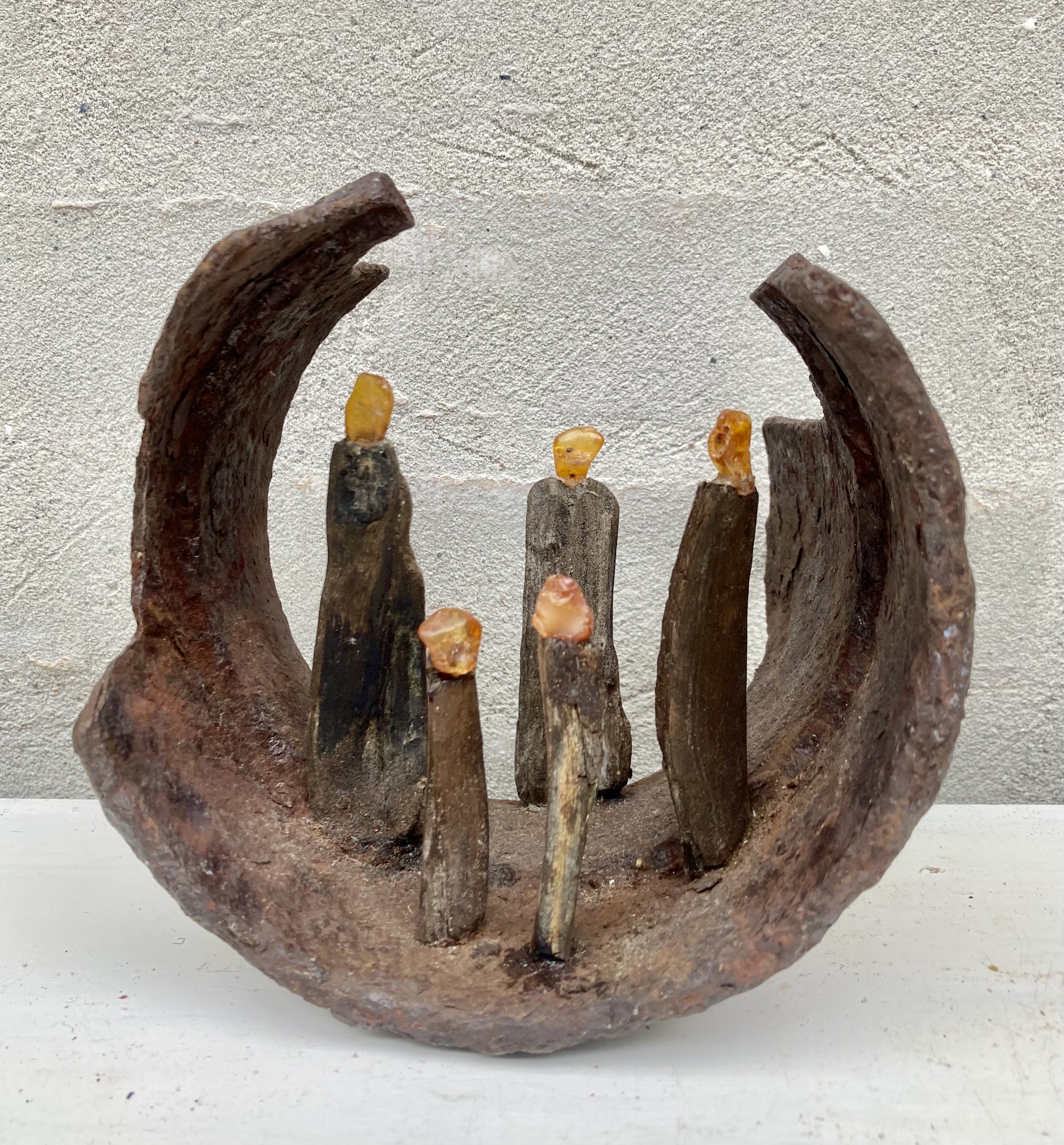 Lisbeth Clausen, Randers, arbejder først og fremmest i genbrugsmaterialer som fx drivtømmer og forvitret jern. Hendes skulpturer viser menneskeskikkelser, lavet af drivtømmer og forsynet med hoveder af rav eller glas. De lever deres liv i verdener af rustent jern, men er samtidig kommentarer til verden udenfor, som fx skulpturen ”Udvist”, hvor tre skikkelser mødes af en lukket jernport.